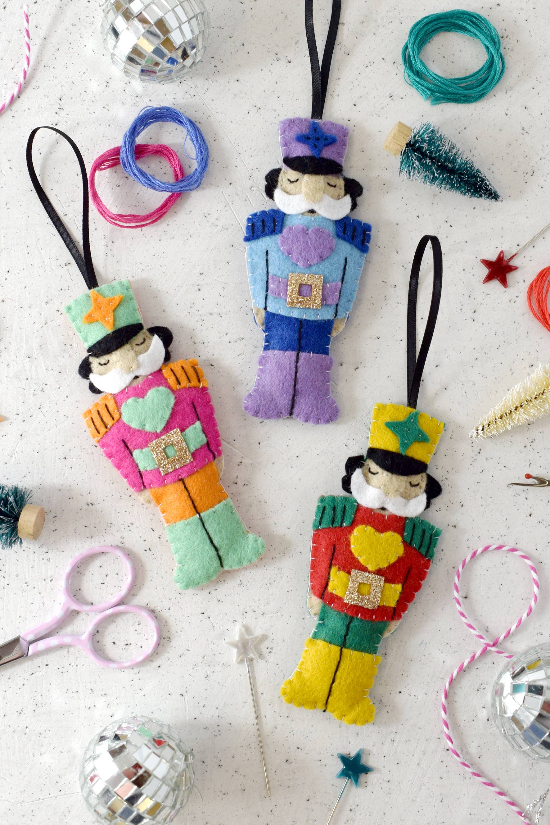 Stitch a set of three colourful nutcrackers for a fun twist on traditional Christmas decorations! This felt project kit is perfect for beginners, as it includes everything you need to sew and assemble these cute ornaments.